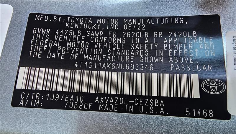 | VIN #: | 4T1G11AK6NU693346 |